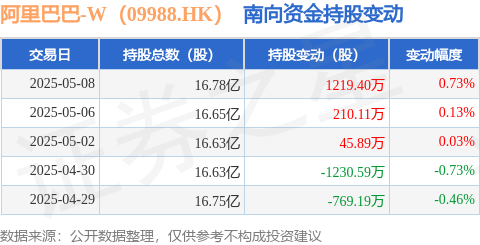 本站消息,5月8日南向资金增持1219.4万股阿里巴巴-W(09988.HK)。近5个交易日中,获南向资金减持的有2天,累计净减持524.38万股。近20个交易日中,获南向资金增持的有15天,累计净增持1.8亿股。截至目前,南向资金持有阿里巴巴-W(09988.HK)16.78亿股,占公司已发行普通股的8.78%。
